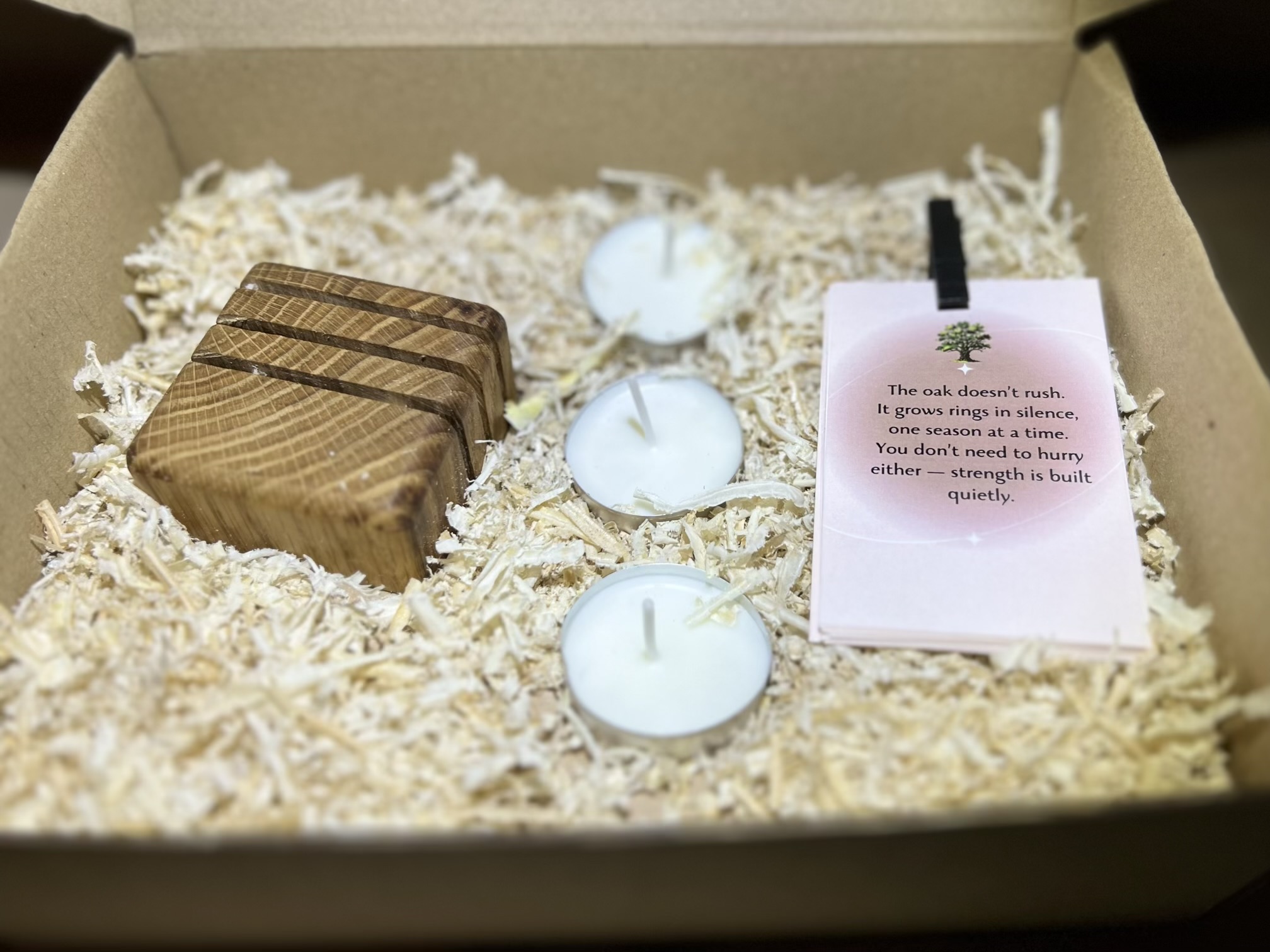 Sukurta rankomis W:OOD dirbtuvėse. Šis rinkinys pagamintas iš tikro ąžuolo — medžio, kuris simbolizuoja tvirtumą, ramybę ir natūralų augimą. Kiekviena žvakidė nušlifuota rankomis, kiekviena žvakė išlieta su mintimi, o kortelės įkvėptos gamtos istorijų ir žmogaus vidinių sezonų. Nieko masiškai, nieko skuboto. Tik nuoširdus, tikras, lėtas darbas — kad jaustųsi, lyg gautum kažką tikrai ypatingo.